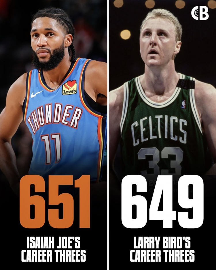 雷霆球员以赛亚·乔目前生涯出场350场,三分球1618投651中,三分命中率为40.2%。而绿军名宿拉里·伯德生涯出场897场,三分球1727投649中,三分命中率为37.6%。